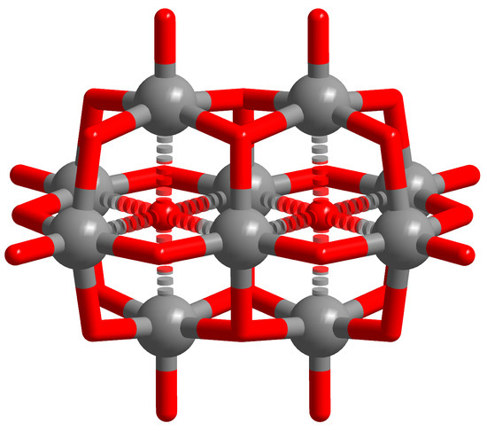 The decametalate structure represents an important structural archetype in POM chemistry (see Figure 1). In the latter structure, ten metal centers occupy the vertices of two virtual octahedra with single-edge sharing topology [17]. Eight of these metal centers connect to terminal oxo atoms. All atoms interconnect to one another via , , and oxo ligands. Two metal centers, forming the core of the POM, do not exhibit terminal oxo ligands. The decavanadate is the most representative and studied decametalate, showing a broad set of applications in the realm of POM chemistry [9,28,29]. NbV- and TaV-based analogs of the decavanadate are also known, and they have been extensively studied over the past years [30,31,32,33].