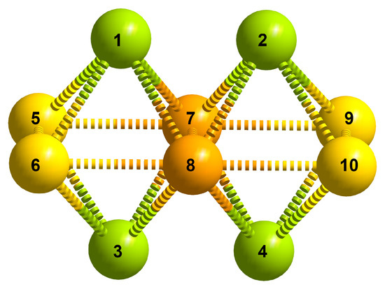 Representation of the relative neighboring positions between the ten M centers in a generic . Green, yellow, and orange coloring is used to depict atom centers that hold configurationally equivalent positions.