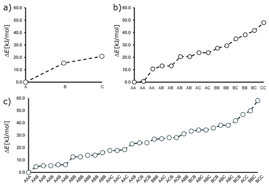 Relative bonding energies () for different configurational isomers calculated at the SP/B3LYP/TZP/COSMO-water level of theory. Configurational isomers of (a) ; (b) ; (c) configurational isomers of . Isomers are ordered in terms of decreasing bonding energy and designated through A, B, and C Mo-occupied positions. For more details, see the Supporting Information file.