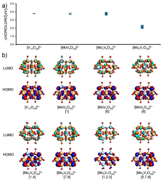(a) HOMO–LUMO gap energies for various polyoxometalate compounds: , , , and . (b) Calculated HOMO (bottom row) and LUMO (top row) molecular orbitals for the same compounds at the SP/B3LYP/TZP/COSMO-water level of theory. Specific configurations: , [1], [6], [8], [1,4], [7,8], and [1,2,3], [5,7,8]. color-coded orbitals illustrate electron density distribution in the HOMO and LUMO.