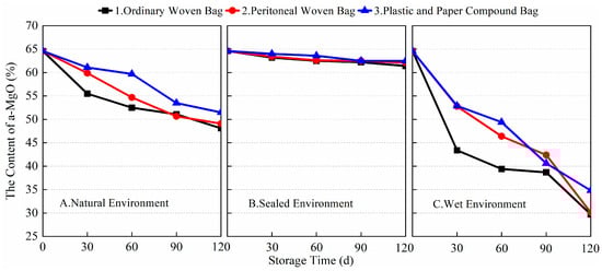 Variation of a-MgO content with storage time under different packaging and storage conditions.