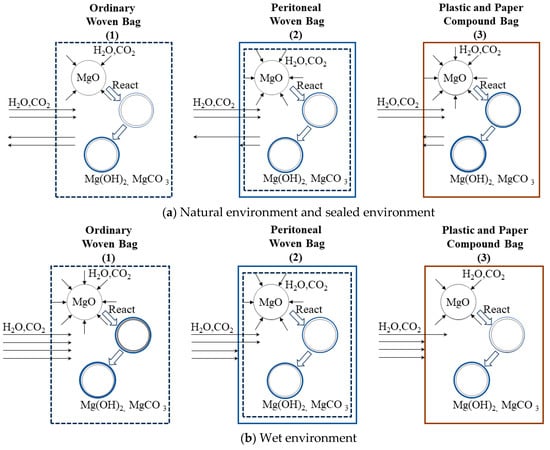 Figure 13 shows the analysis of the mechanism of MgO activity in different packaging and storage conditions. Combined with the above research data and the schematic diagram in Figure 13, in the natural environment and sealed environment, the ordinary woven bag was favorable to the exchange of moisture and carbon dioxide inside and outside the bag compared with the peritoneal woven bag and plastic and paper compound bag, which reduced the possibility of moisture absorption and carbonization of the MgO. The peritoneal woven bags and plastic and paper compound bags had good sealing, which was not conducive to internal moisture and carbon dioxide discharge, where light-burned MgO is more prone to moisture absorption and carbonization. Therefore, in the natural environment, BMSC packaged in ordinary woven bags was more conducive to ensuring the mechanical properties of the BMSC. In the wet environment, moisture and carbon dioxide contents were high, and ordinary bag pores allowed a lot of moisture and carbon dioxide inside, causing MgO hydrolysis or carbonization. Plastic and paper compound bags and peritoneal woven bags had better airtightness than ordinary woven bags and could better prevent moisture and carbon dioxide from entering, thereby reducing the potential for light-burned MgO reactions with water and carbon dioxide. Therefore, in a wet environment, plastic and paper compound bag and peritoneal woven bag encapsulation are more advantageous for storing light-burned MgO and BMSC.