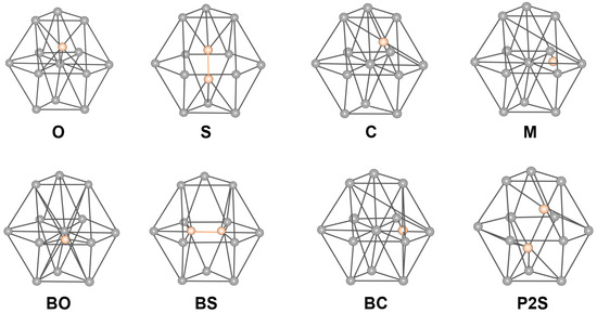 In addition to the dynamic diffusion simulations, static calculations were performed to obtain the formation energies of the different interstitial configurations (BO: basal octahedral, BS: split dumbbells in the basal planes, BC: basal crowdion, O: octahedral, S: split dumbbells along the c-axis, C: crowdions, M: a configuration close to BO, and P2S: obtained by rotating the S configuration), as represented in Figure 1 [21]. The interstitial formation energy was calculated as: