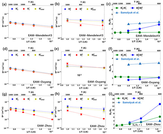 Diffusion behavior in pure Zr with (a–c) EAM-Mendelev#3, (d–f) EAM-Ouyang, and (g–i) EAM-Zhou potential: (a,d,g) tracer diffusion coefficients and (b,e,h) interstitial diffusion coefficients along different directions (a: basal plane, c: c-axis); (c,f,i) diffusion anisotropy parameters. The DFT results of anisotropy parameters from Samolyuk et al. [9] are marked as blue triangle.