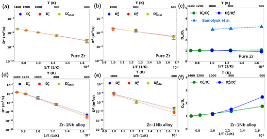 Diffusion behavior in (a–c) pure Zr and (d–f) Zr-1Nb alloy with the ADP-Starikov potential: (a,d) tracer diffusion coefficients and (b,d) interstitial diffusion coefficients along different directions (a: basal plane, c: c-axis); (c,f) diffusion anisotropy factors. The DFT results of anisotropy parameters from Samolyuk et al. [9] are marked as blue triangle.