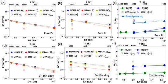 Diffusion behavior in (a–c) pure Zr and (d–f) Zr–1Sn alloy with MEAM-Mei and MTP-Mei potential: (a,d) tracer diffusion coefficients and (b,d) interstitial diffusion coefficients along different directions (a: basal plane, c: c-axis); (c,f) diffusion anisotropy factors. The DFT results of anisotropy parameters from Samolyuk et al. [9] are marked as blue triangle.