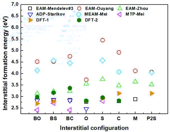 Second, we noticed a large difference in the magnitude and the relative order of the interstitial formation energies among the different potentials (see Table 2 and Figure 5). The BO configuration is the most stable interstitial configuration according to DFT studies with large supercells [1,9,17]. However, only the BO configurations in EAM-Zhou and MTP-Mei had the lowest formation energy. We note that the BC configuration also had the same lowest formation energy as that of BO in the MTP-Mei. In the MEAM-Mei potential, although the BO structure was not the most stable structure, the formation energy was relatively low and was only 0.07 eV–0.09 eV higher than the most stable C and P2S structures. With EAM-Mendelev#3, EAM-Ouyang, and ADP-Starikov, the O configuration was the most stable structure. Next, according to DFT calculations, the BS and O configurations should have relatively low formation energies, differing by 0.1–0.2 eV from the BO configuration [1,17]. Meanwhile, other configurations should have higher formation energies. These two trends can hardly be fully satisfied by the studied DFT potentials; either the formation energies for the BS or O configuration were not sufficiently low, or other configurations also had low formation energies. Nevertheless, most potentials could maintain a fairly good consistency in relative energy for some of the interstitial structures. The EAM potential lacks angular dependence in its energy formulation. Therefore, it may be challenging to accurately represent all the interstitial configurations.