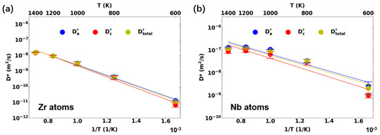When 1.0 at. % Nb was added, there was a significant reduction in both the atomic and defect diffusion coefficients. It was found that the Zr-Nb interstitial tended to form and diffused slowly compared to the diffusion of the Zr interstitial or Zr-Zr dumbbell in pure Zr. The diffusion of each individual element will be further discussed in Section 3.3. The self-diffusion coefficient of the dilute Zr-1Nb alloy, which included the equilibrium interstitial concentration, was compared with the experimental results in the original study of ADP-Starikov, showing a good agreement in magnitude [22]. The inclusion of 1% of Nb significantly increased the total activation energy to 0.58 eV. Pronounced diffusion anisotropy was observed in Zr-1Nb, showing an increase in anisotropy as the temperature decreased. Despite the discrepancy in pure Zr diffusion anisotropy, the results here suggest that Nb interstitial migration is favored in the basal direction, especially at lower temperatures.