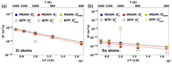 In the Zr-1Sn alloy, the Sn atoms exhibited extremely low diffusion coefficients with the MEAM-Mei potential, which were about four orders of magnitude lower than those of Zr. The lower Sn mobility resulted in the large uncertainty shown in Figure 7b. Based on DFT calculations, the Zr-Sn interstitial had low formation energies, with the most stable configuration being ~1 eV lower than the most stable Zr interstitial atom. This indicated that a Zr-Sn interstitial should be highly likely to form during diffusion [11]. This seems contradictory to the results from the studied potential. The Zr-Sn cross-interactions mostly took into account the properties of the various Zr-Sn intermetallic compounds. Therefore, the Sn-related defect properties in Zr solid solution may not be accurately described. Nevertheless, it is worth noting that, with MEAM-Mei, the addition of 1 at% Sn changes the chemical environment of Zr interstitial atoms, resulting in a stronger interstitial diffusion anisotropy with respect to pure Zr. This effect highlights the importance of dilute solute atoms on Zr diffusion. With the MTP-Mei potential, the Zr diffusion coefficient in Zr-1Sn was close to that of MEAM-Mei along the basal plane, but the diffusion along the c-axis was greatly suppressed. The Sn atoms in Zr-1Sn diffused slightly slower than the Zr atoms in Zr-1Sn, but much faster than the Sn atoms in the MEAM-Mei potential. In addition, Sn diffusion did not exhibit any diffusion anisotropy. However, the addition of Sn changed the interstitial diffusion anisotropy of the overall alloy (see Figure 4), suggesting that solute atoms have a profound impact on interstitial migration dynamics. Determining the actual behavior of Sn solutes in Zr requires the consideration of different migration pathways and needs to be validated through DFT calculations. This further indicates that the accuracy of interstitial diffusion heavily depends on the interatomic potential, including both its form and the properties considered in its fitting.