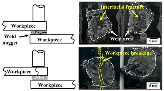 The fractured surfaces of the joints after tensile testing are observed and two main fracture modes of interfacial failure and workpiece breakage are presented as shown in Figure 6. The joint usually fractures at the nugget for underweld joints (welding time shorter than 1.1 s) where the insufficient weld area cannot bear enough tensile force. Prolonging the welding time to above the optimal value, the joint is likely to break at the workpiece (mostly at the upper workpiece), which is closely related to the material property [28] and will be elaborated on later.