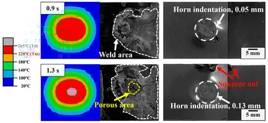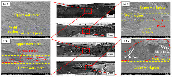 Careful examination of the fractured morphology of the joint shown in Figure 7 shows that the weld area expands with the welding time and there is a loose microstructure with pores on the surface when it exceeds the optimal time. The effective bonding region is localized in an approximately circular area (directly under the welding horn) and the bonding area can be categorized into two types: compact normal weld area and loose porous area. The microstructure in the normal weld area is dense, while numerous deconsolidation voids appear in the central area of the weld region and are labelled as porous regions in Figure 7. Cross-sectional morphologies of representative joints welded in 1.1 s, 1.3 s, 1.5 s and 1.7 s are observed to analyze the weld nugget. Referring to Figure 8, there is no obvious boundary between the weld zone and matrix when the welding time is less than 1.1 s. The distinction of the weld region is mostly based on the direction of the fracture texture, where the stress conditions for upper and lower workpieces during the tensile test are different. Increasing the welding time to 1.3 s, some pores randomly distribute in the weld zone. The pore increases in density and quantity. The thickness of the porous layer increases with increased welding time, which is harmful to the joint [7,29]. For joints made in 1.7 s, the scale of the porous region enlarges remarkably, and it exhibits a mouth-like shape, where the thickness of the lateral side is small and the central region is relatively large. This behavior is intimately associated with heat generation and melt flow during USW [12,18,29], where thermal decomposition of the polymer releases gases. The pressure in the gases is large, and large pores extend to the faying interface and squeeze the molten materials out. The decomposed material flows bilaterally along the weld area and forms a mouth-like shape (joints with a 1.7 s welding time).