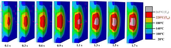 To fully understand the weld formation of ultrasonically welded ABS, the joints made with 0.13 MPa and 1.7 s are simulated using Abaqus 6.22 software, and the side views of the simulated weld with various welding times are shown in Figure 9. The melting temperature of the matrix is assigned as Tm while the thermal decomposition point is denoted as Td. The regions in red or grey color represent the polymer melts or decompose under ultrasonic heat. The highest temperature at the contact interface is in the middle of the overlapped region. Surprisingly, the polymer melts with only a 0.1 s welding time, which is much faster than that of polyamide composites [6,18]. This characteristic verifies that the amorphous polymer is easier to weld than the a polymer with a semi-crystal structure [29,30,31]. With increased welding time, the red melted region expands gradually into the X/Y/Z plane. The grey decomposed region emerges at joints made in 1.1 s and displays an analogous expansion trend with the melted region.
