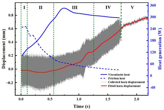 Real-time vibrations for joints with a 1.7 s welding time (the semi-transparent grey region) are also included in Figure 10. As seen from the enlarged view of horn displacement, the vibrations are complicated and change quickly during USW. Hence, simulating weld growth of ultrasonically welded ABS by applying real-time vibration into the model should primarily improve simulation accuracy. Horn displacement in Figure 10 exhibits typical characteristics in the USW of thermoplastics [33,34], and the weld area of the simulated area and measured areas shows similar varying trends in Figure 11, Figure 12, Figure 13 and Figure 14 as expected. Comprehensively considering the variation characteristics in amplitude, vibration, horn displacement and energy dissipation, the weld formation of ultrasonically welded 2 mm-thick ABS without energy can be divided into five phases.