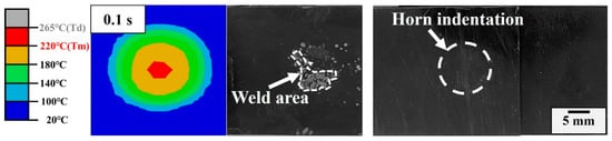 At the initial stages of USW, the upper and lower workpieces retain their stiffness and toughness, along with the rough surface of the adherends. Before the steady melt forms, the perpendicular vibrations transfer to horizontal deformation at the interface of workpieces. Horizontal deformation adds to slippage and friction at the interface. Friction generates heat on the rough surfaces of workpieces. Once the weld nugget forms, frictional heat greatly decreases. When the temperature of the workpiece rises up to above the glass transition temperature under friction heat, viscoelastic dissipation dominates the ultrasonic welding process, as shown in Figure 10 (blue lines).