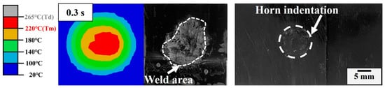 Preliminary experiments show the welding pressure of 0.13 MPa is more suitable for the USW of ABS. Herein, the effect of the welding time on peak load and weld area of the joint welded with a welding pressure of 0.13 MPa is evaluated as shown in Figure 5. With the increase in the welding time, the peak load of the joint increases to the maximum value of 3.4 kN and then decreases, while the weld area (measured by the IPP 6.0 software) expands gradually to a plateau. A peak load of 0.37 kN is obtained for the joint with a 0.1 s welding time, and the joint strength and weld area increase dramatically in the first 0.9 s then increase moderately to their peak values. Combining the peak load and weld area, the optimal welding time is selected as 1.3 s, where it can reach the maximum peak load and weld area. Interestingly, the data variance in joint strength becomes larger when the welding time is extended to above 1.3 s. This characteristic is likely attributed to the thermal decomposition of ABS, where the position and distribution of the resultant porous region affect the joint strength severely [6,28].