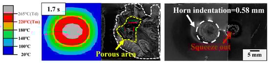Phase II (0.1~0.6 s): This stage is an unsteady phase. The amplitude changes irregularly and the small asperities at the contact surface melt gradually to form a favorably intimate contact condition for the following phase. Fiction and viscoelastic heat together dominate weld growth at this stage [18]. The heat reduces the stiffness of the interface layers inside the weld apex and the sinusoidal cyclic strain focuses on the softer interfacial area to expand the weld area, as shown in Figure 12. The simulated result is smaller than the measured one owing to the flow and expansion of the melt. A slight horn indentation is presented on the joint. A downward trend in displacement at Phase II is presented in Figure 10, which is mainly due to the thermal expansion of the ABS matrix under the accumulation of ultrasonic heat and causes horn retraction.