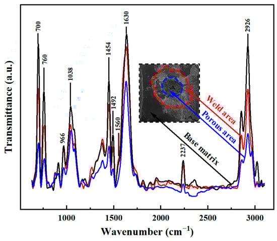 Phase IV (1.3~1.7 s): This phase is characterized by a combination of horn indentation on the upper workpiece and squeezed out of molten ABS. The amplitude at this stage is much more stable and the displacement of the horn increases linearly with the welding time (with a larger increase rate than that in Phase III). At this phase, more viscoelastic dissipation is consumed within the workpiece and leaves numerous voids in the weld region and deep indentation on the joint surface (Figure 14). To thoroughly understand the origin of the pores, Fourier transform infrared spectroscopy (FTIR) tests are conducted in the ABS matrix, weld area and porous region. Referring to Figure 15, the bending vibration of C-H, deformation of C-H for hydrogen atoms and out-of-plane C-H bending in ABS polymer are in the range of 700–1038 cm−1. Stretching vibration peaks of the benzene ring, C≡N and C=C are present at 1450–1600 cm−1, 2237 cm−1 and 1630 cm−1, respectively. The aromatic and aliphatic C-H are detected at 3200–2800 cm−1 [36,37]. It is clear that the peak positions are similar but the absorption intensity differs significantly. The peak intensity for the porous area is much lower, but similar for the weld area and the matrix, indicating the ABS material decomposes in the porous area [28,38]. Generally, a solid joint should have a dense microstructure, thus the occurrence of this phase is detrimental to the joint strength and should be avoided in actual production.