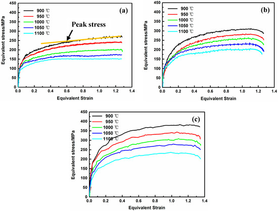 Equivalent stress vs. equivalent strain curves for HSCD of Fe-38Mn alloy at axial strain rates of (a) 0.01 s−1, (b) 1 s−1 and (c) 10 s−1.