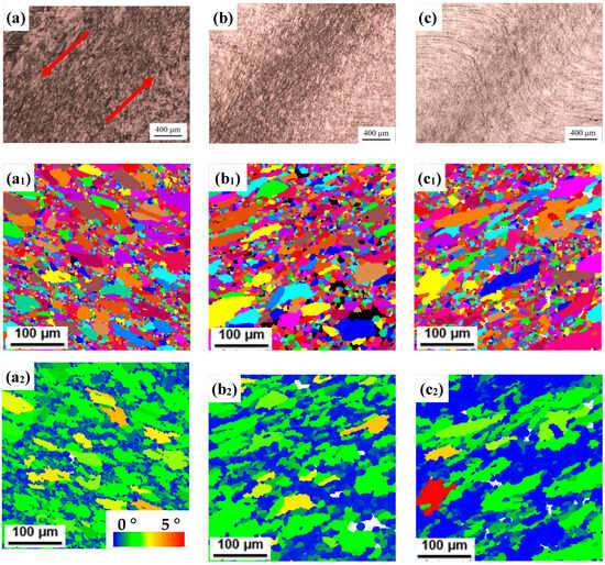 Typical deformation microstructures: OM images in the conditions of (a) 900 °C, 0.01 s−1, (b) 900 °C, 1 s−1 and (c) 900 °C, 10 s−1, EBSD Grain images in the conditions of (a1) 900 °C, 0.01 s−1, (b1) 950 °C, 1 s−1 and (c1) 900 °C, 10 s−1 and EBSD GOS maps in the conditions of (a2) 900 °C, 0.01 s−1, (b2) 950 °C, 1 s−1 and (c2) 900 °C, 10 s−1.