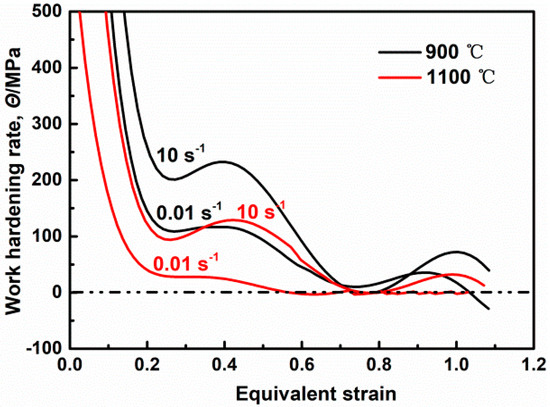 Metals generally undergo strain or work hardening during plastic deformation, meaning that the flow stress of the metals continually varies with plastic strain [1]. The work hardening behavior of hot deformation is the result of competition between work hardening caused by the form of dislocation and dynamic microstructural softening caused by the annihilation of dislocations taking place either through dynamic recovery (DRV) or dynamic recrystallization (DRX) [2,3,4,5]. In addition, thermal softening due to the strain rate leads to strain localization. Therefore, in general, the theoretical work hardening rate curve of thermal deformation is divided into different stages, which is related to but not limited to dislocations, dynamic microstructural softening and thermal softening [6,7,8,9].