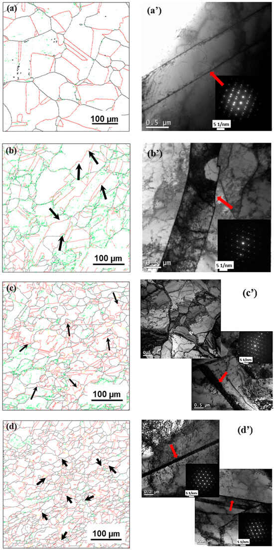 Microstructures of initial and typical stages with strain levels of 0.3, 0.6 and 0.9 at 110 °C, 10 s−1: (a–d) grain boundary distribution mapping of EBSD, (a’–d’) TEM images.