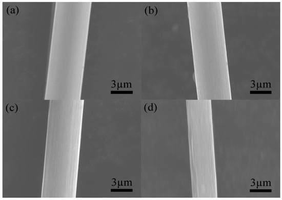 Morphology of carbon fibers under different temperature treatments: (a) 300 °C; (b) 400 °C; (c) 500 °C; (d) 600 °C.