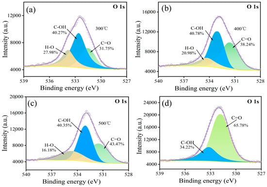 Figure 4 presents the O1s peak spectra obtained from the surface of carbon fibers subjected to oxidation at varying temperatures. Figure 4 presents the C1s peak spectra obtained from the surface of carbon fibers subjected to oxidation at varying temperatures. Analysis of these spectra, based on the established binding energy values for different oxygen valence states, indicates the presence of C-OH, C=O, and H-O functional groups as the primary surface functionalities. With an increase in temperature, the content of C=O groups keeps increasing, while the content of H-O groups keeps decreasing, as shown in Figure 4a–c. When the temperature exceeds 600 °C, as shown in Figure 4d, H-O groups disappear, and the content of C=O groups increases to 65.78%. This is because the number and type of oxygen-containing functional groups on the surface of the carbon fiber change with an increase in the heating temperature. The carbonyl group content (C=O) is continuously increased, and the conversion of H-O into water means the H is consumed.