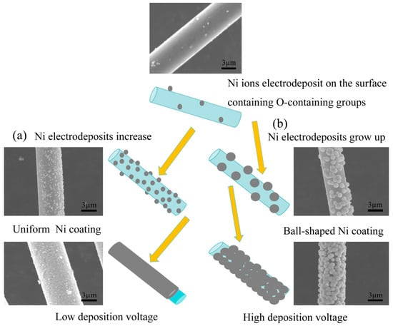 The reduction of Ni2+ ions during electrodeposition onto carbon fibers is a process influenced by multiple factors beyond the applied deposition voltage. The chemical state of the fiber surface, specifically the presence of oxygen-containing functional groups, plays a crucial role in facilitating the reduction process. These functional groups, such as -OH and -COOH, act as active sites with a lower potential, thereby promoting electrochemical reactions [42,43]. Upon the application of an electric potential, Ni2+ ions are preferentially reduced at these active sites due to their lower energy barrier. This initial reduction leads to the adsorption of metallic Ni at these locations. However, due to the limited number of active functional groups, the Ni particles on the fiber surface remain sparse at this stage, as depicted in the top image in Figure 12. This stage of electrocrystallization follows instantaneous nucleation and a three-dimensional growth mode. With the sustained application of a low deposition potential (near the equilibrium potential), the rate of nucleation generation and dissolution remain comparable, resulting in a weak reduction of Ni2+ into metallic Ni. As the deposition potential increases, additional functional groups participate in the reduction reaction, leading to a higher density of reduction points. However, with further increases in the deposition potential, the effect of the functional groups becomes less significant. The process becomes dominated by the initial nucleation and growth driven by the applied potential, resulting in a uniform and smooth deposition layer on the fiber surface (Figure 12a). In contrast, when a high deposition potential is applied instantaneously, the rapid reduction of Ni crystals at the active sites enhances the local conductivity. This leads to the preferential reduction of Ni2+ ions at these points, causing the Ni crystals to grow larger. This self-growth is further amplified by the electrodeposition tip effect, characterized by a faster reduction rate of the metal ions at the tip, finally leading to the formation of a spherical morphology (Figure 12b). Therefore, the reduction of Ni ions during Ni electrodeposition is not solely driven by the applied potential. Instead, it arises from an additive effect between the applied potential and the reducing action of the active functional groups on the carbon fiber surface. These functional groups promote the preferential reduction of Ni2+ ions at specific locations, influencing the morphology and distribution of the deposited Ni layer.