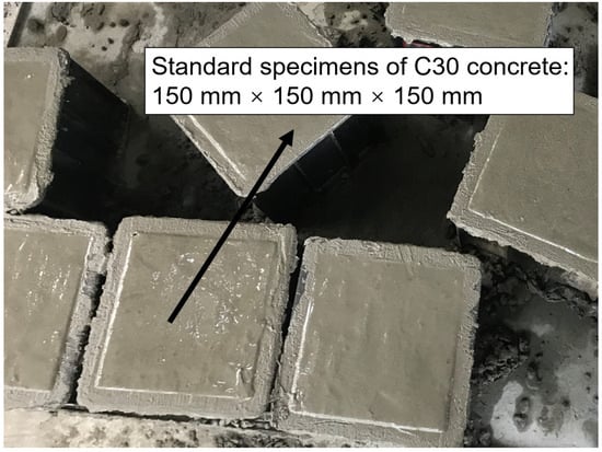 The cement used in this test was P.042.5 ordinary Portland cement from Chongqing Huaxin Fortress; its basic properties are shown in Table 1. The coarse aggregate used was limestone crushed stone with a particle size of 5 to 20 mm; its basic properties are shown in Table 2. The fine aggregate utilized was natural river sand, and tap water from the laboratory was used for mixing. According to the “Regulations for the Design of Hydraulic Concrete Mix Ratio” (DLT5330-2015) [], C30 concrete specimens with water–cement ratios of 0.44, 0.49, and 0.54 were prepared. Each specimen measured 150 mm × 150 mm × 150 mm, with four samples fabricated for each ratio, resulting in a total of 12 cubic samples, as shown in Figure 1. The mix proportions are detailed in Table 3. Following casting, the concrete specimens underwent natural curing for 24 h before demolding. After demolding, the specimens were placed in a curing room maintained at a temperature of (20 ± 2) °C and a relative humidity exceeding 95% for 28 days.