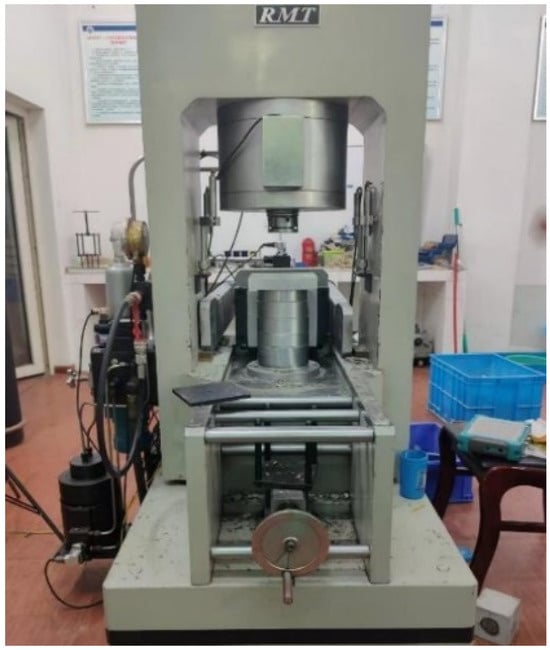 The test was conducted in accordance with the “Standard for Test Methods of Physical and Mechanical Properties of Concrete” (GB/T 50081-2019) []. The uniaxial compression test was conducted using the RMT-150 rock mechanics test machine which was designed and manufactured by Wuhan Institute of Rock and Soil Mechanics, Chinese Academy of Sciences, as shown in Figure 2. This test system enabled the acquisition of real-time stress–strain data of the specimens under compression.