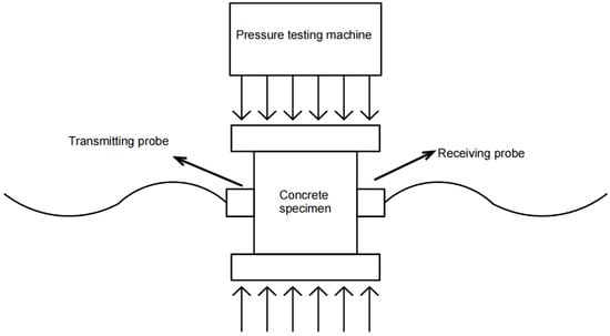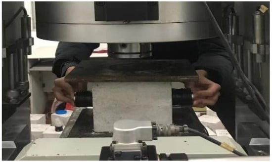 The RSM-SY5 (T) non-metallic acoustic detector, manufactured by Wuhan Zhongyan Science and Technology Co., Ltd. (Wuhan, China) of China, was used for the ultrasonic testing experiment, operating at an ultrasonic frequency of 50 kHz. During the uniaxial compression of the concrete specimens, ultrasonic testing was performed using the transmission method. Ultrasonic parameters were gathered every 25 kN until the specimens failed. The on-site ultrasonic testing setup is shown in Figure 3, and the schematic diagram of the arrangement of the ultrasonic signal transmitting and receiving devices is shown in Figure 4. These devices were symmetrically arranged on the sides of the compressed concrete specimen to facilitate optimal ultrasonic signal collection.