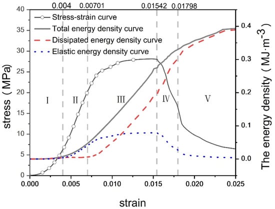According to the stress–strain characteristics and the law of energy evolution, the energy evolution of concrete during compression can be divided into five stages: (I) void compaction stage, (II) elastic stage, (III) plastic stage, (IV) failure stage, and (V) post-failure residual strength stage []. In the energy evolution characteristic curve, the elastic energy density and the dissipated energy density of concrete with different water–cement ratios exhibit the same characteristic trends as their corresponding total energy density. Therefore, concrete with a water–cement ratio of 0.44 was selected, and the corresponding energy evolution characteristic diagram was sketched based on Equations (1)–(4), as shown in Figure 6. As shown in the figure, with the increase in strain, the total energy and dissipative energy gradually increase, while the elastic energy initially rises and then declines.