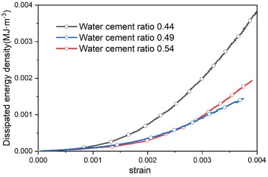 During the compression process of concrete specimens, the development of cracks is closely related to the increase in dissipated energy [] with internal damage resulting from energy dissipation. As shown in Figure 8, the characteristics of the pore compaction stage are more pronounced in concrete specimens with a lower water–cement ratio. In this stage, the dissipated energy curve shows a uniformly ascending trend. The concrete specimen with a water–cement ratio of 0.44 exhibits the greatest increase in dissipated energy and the most rapid growth rate, while the specimen with a water–cement ratio of 0.54 shows the smallest increase with its dissipated energy curve growth rate similar to that of the specimen with a 0.49 ratio. This is because the magnitude of dissipated energy in the pore compaction stage primarily depends on the plastic work performed by external forces in compressing the pores. Therefore, the greater the initial porosity of the concrete, the higher the dissipated energy [].