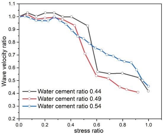 Ultrasonic nondestructive testing technology is frequently employed to detect flaws within concrete and monitor the progression of cracks. The alteration of ultrasonic wave velocity can infer the development of concrete cracks and assess the porosity magnitude of concrete specimens with different water–cement ratios []. The point measurement method is employed to measure changes in ultrasonic wave velocity during the compression process of concrete specimens. The curve of the wave velocity ratio and stress ratio of the concrete specimens under different water–cement ratio conditions is plotted, as depicted in Figure 9.