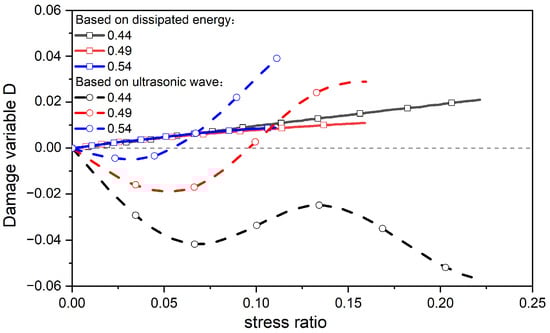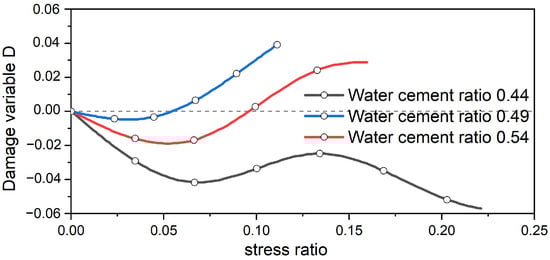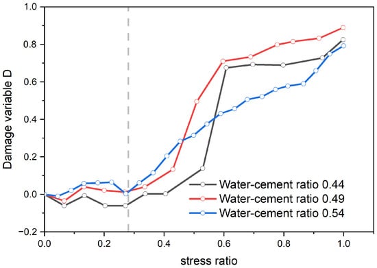 From Figure 14, it can be discerned that the overall alteration tendency of concrete specimens with diverse water–cement ratios is identical, and the damage variable curve generally increases with the increase in stress. There is a threshold for the damage variable of the concrete specimen. When the stress ratio is below this threshold, the damage variable assumes a wavelike form with no distinct change. When the stress ratio exceeds the threshold, the damage variable escalates rapidly. During the rapid increase in the damage variable, the ascending rate is greatest for the concrete with a water–cement ratio of 0.44, while it is smallest for the concrete with a ratio of 0.54. This indicates that the microcrack development rate in concrete specimens with a higher water–cement ratio is relatively sluggish, whereas specimens with a lower water–cement ratio develop a large number of microcracks in a short period. In conclusion, the damage variable defined by ultrasound can reflect the damage characteristics of the concrete specimen as a whole, which is consistent with the results obtained in the literature [].
