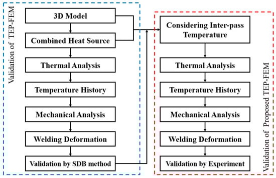 A numerical computational framework was used to efficiently analyze the welding deformation, as shown in Figure 1. Welding deformation and residual stress were analyzed using TEP-FEM. First, to validate the accuracy of the TEP-FEM analysis, it was compared with the SDB method, which does not consider the convection and radiation conditions or the temperature history of each bead. Subsequently, considering the interpass temperature, TEP-FEM was performed by increasing the temperature by 100 °C from 200 °C to 1000 °C. Finally, compared with the experiment, the interpass temperature with the lowest welding deformation error was verified.