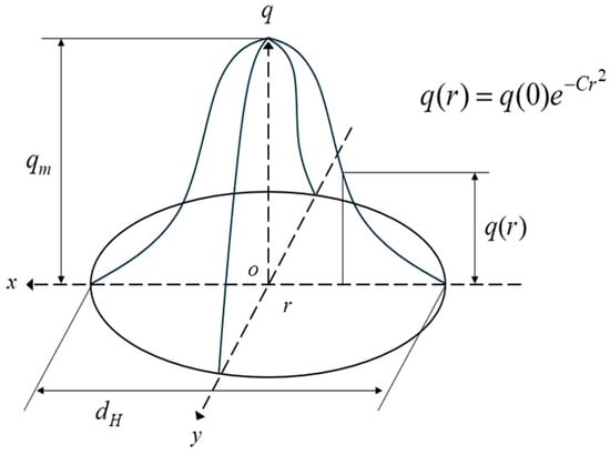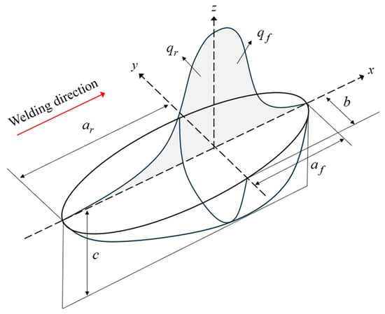The temperature load used in the thermal analysis was distributed differently depending on the heat source model, and was calculated using the Fourier heat conduction equation. These heat source models include the Gaussian (Figure 3) and double ellipsoidal models (Figure 4) [20]. A 3D Gaussian heat source model is typically utilized to simulate electron beams or laser welding, whereas the Goldak heat source model, characterized by its double ellipsoidal shape, is commonly employed for arc welding. In the latter case, the front and rear ellipsoids can be separately calibrated and fitted to the welding process, thereby enabling the heat source to simulate low-penetration welding. The power density distributions in the front and rear quadrants of Goldak’s double ellipsoidal heat source model used in this study are described using Equations (7) and (8), respectively.