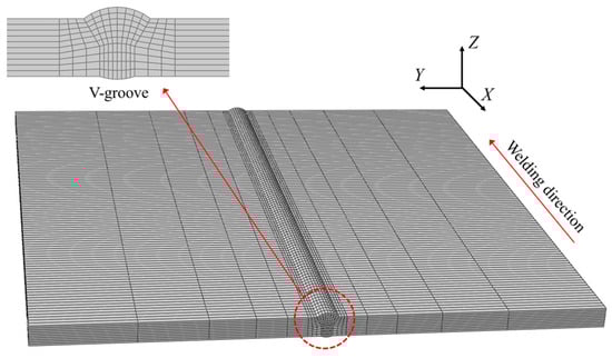 As shown in Figure 2, a V-groove multi-pass welding plate consisting of four bead layers was fabricated. The base metal was simplified to SUS304 austenitic stainless steel with a thickness of 10 mm. The dimensions of the joints were 300 mm × 300 mm.
