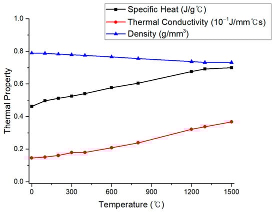where is the density, is specific heat capacity, is the current temperature, is the internal heat generation rate, and is the thermal conductivity. Thermal properties, such as specific heat and thermal conductivity, change depending on the material used. The thermal properties of SUS304 austenitic stainless steel used in this study are shown in Figure 6 [21].