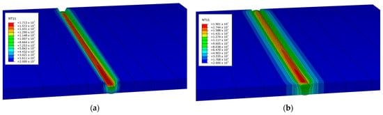 The thermal and mechanical analyses performed in this section also used the same FE model (Figure 5 and Figure 10) and TEP-FEM considering the interpass temperature.