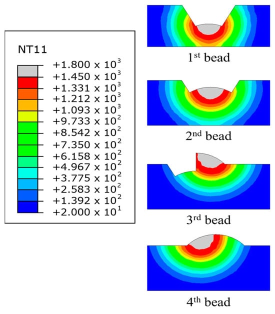 Thermal analysis of the FE model, which consists of four bead layers, does not weld all beads at once but is conducted sequentially using the “Model Change” function in ABAQUS. When the initial bead was welded using Model Change, every component from the first pass was integrated into the FE model, whereas the other passes were left out as shown in Figure 7.