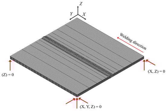 The same mesh used in the thermal analysis was used for the mechanical analysis, except for the element type (C3D8I in ABAQUS) and boundary conditions. In actual welding, there are no boundary conditions. However, in the mechanical analysis, boundary conditions are provided, as shown in Figure 10, to prevent rigid-body modules.