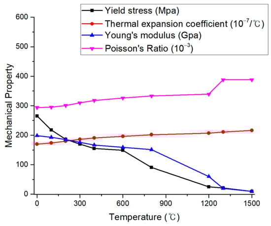 where the elastic strain is represented by , plastic strain by , and thermal strain by . During the mechanical analysis, isotropic Hooke’s law was utilized to model the elastic strain, with Young’s modulus and Poisson’s ratio being temperature-dependent, as shown in Figure 11 [21].