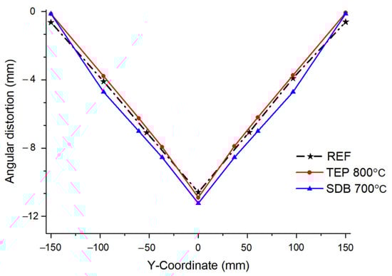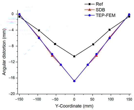 However, as the welding is assumed to cool to room temperature in TEP-FEM, such as SDB, it derives values that differ from the actual welding deformation [22], as shown in Figure 13. However, the error was very small compared with the SDB result [19].