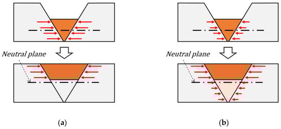 The same method and mesh were used as previously described for the TEP-FEM; however, in this section, weld deformation is analyzed considering the interpass temperature. In this case, as mentioned in Section 3, solid-state phase transformation was not considered; however, an alternative to phase transformation can be provided by considering the shrinkage by volume of the weld zone according to the interpass temperature. Figure 14 shows the internal shrinkage in the heated area of a multi-pass weld. A weld cooled to room temperature may generate internal shrinkage in the heated area, as shown in Figure 14a. In addition, each bead shrank without reducing the overall bending moment. For this reason, more welding deformation may occur if the interpass temperature is not considered. However, as shown in Figure 14b, a weld that is not cooled to room temperature will merge with other beads without completing internal shrinkage. Therefore, the heated area where the internal shrinkage occurred became thicker, and the overall bending moment decreased.
