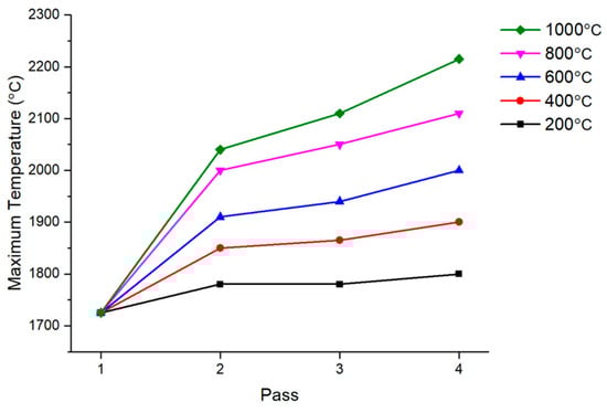 As the interpass temperature increased, the maximum temperature observed in the temperature history also increased, as shown in Figure 16. When welding was performed while cooling to room temperature, the maximum temperature was 1725 °C. However, at an interpass temperature of 1000 °C, the maximum temperature increased to 2215 °C. Additionally, the increased maximum temperature directly affected the HAZ. Figure 17 shows the temperature history during multi-pass welding when the temperature was the highest. As indicated in the legend, 750 °C is the temperature at which martensite, having a negative effect on mechanical properties, mainly occurs.