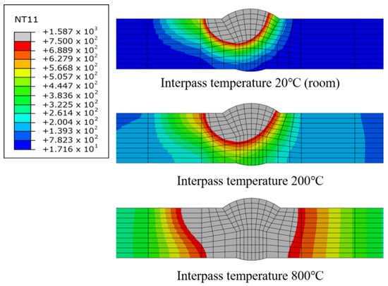 Comparing the interpass temperatures of 20 °C and 200 °C, the areas exceeding 750 °C appear similar. However, at 200 °C, the temperature increased slightly in the area around the HAZ. Comparing the internal temperatures of 200 °C and 800 °C, we can see that the HAZ clearly expanded at 800 °C. As the HAZ changes rapidly depending on the interpass temperature, the TEP-FEM proposed in this study should be used instead of the previously used SDB study. However, although an increase in the HAZ reduces welding deformation, it may also have a negative effect on mechanical properties later, so the pass temperature must be appropriately controlled.