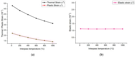 When the interpass temperature was 800 °C, the angular distortion was 10.9 mm. The deformation error was 2.62% compared to the actual welding angular distortion [22]. However, when the interpass temperature was 1000 °C, the angular distortion was the lowest at 9.4 mm, but the error increased by 11.23%. In other words, as the interpass temperature increases, decreasing the angular distortion implies that the total strain expressed in Equation (13) decreases. Figure 19 shows the various strains depending on the interpass temperature. Among the total strains, the thermal, plastic, and elastic strains accounted for the largest proportion, in that order. The thermal strain was more than twice as large as the plastic strain, as shown in Figure 19a.