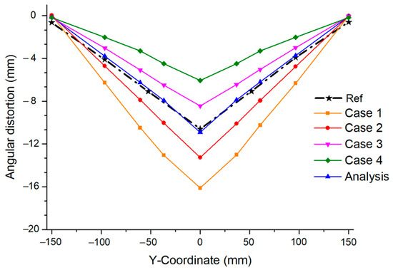 Angular distortion analysis due to changes in welding current was confirmed using the same heat source and interpass temperature as the analysis of changing the welding speed. The detailed welding parameters are specified in Table 3.