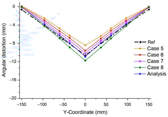 Through the above welding deformation analysis using TEP-FEM, we confirmed that as the interpass temperature increased, the angular distortion decreased. Additionally, the deformation prediction error was the lowest when the interpass temperature was 800 °C. However, the optimal interpass temperature for all welds is not 800 °C. Welding deformation prediction is complex, and many factors other than the interpass temperature affect welding deformation. Therefore, to improve the rationality of welding deformation prediction considering the interpass temperature, another welding deformation analysis was performed in which the interpass temperature (800 °C) was the same, but the welding parameters, such as the welding speed and welding current, were changed.